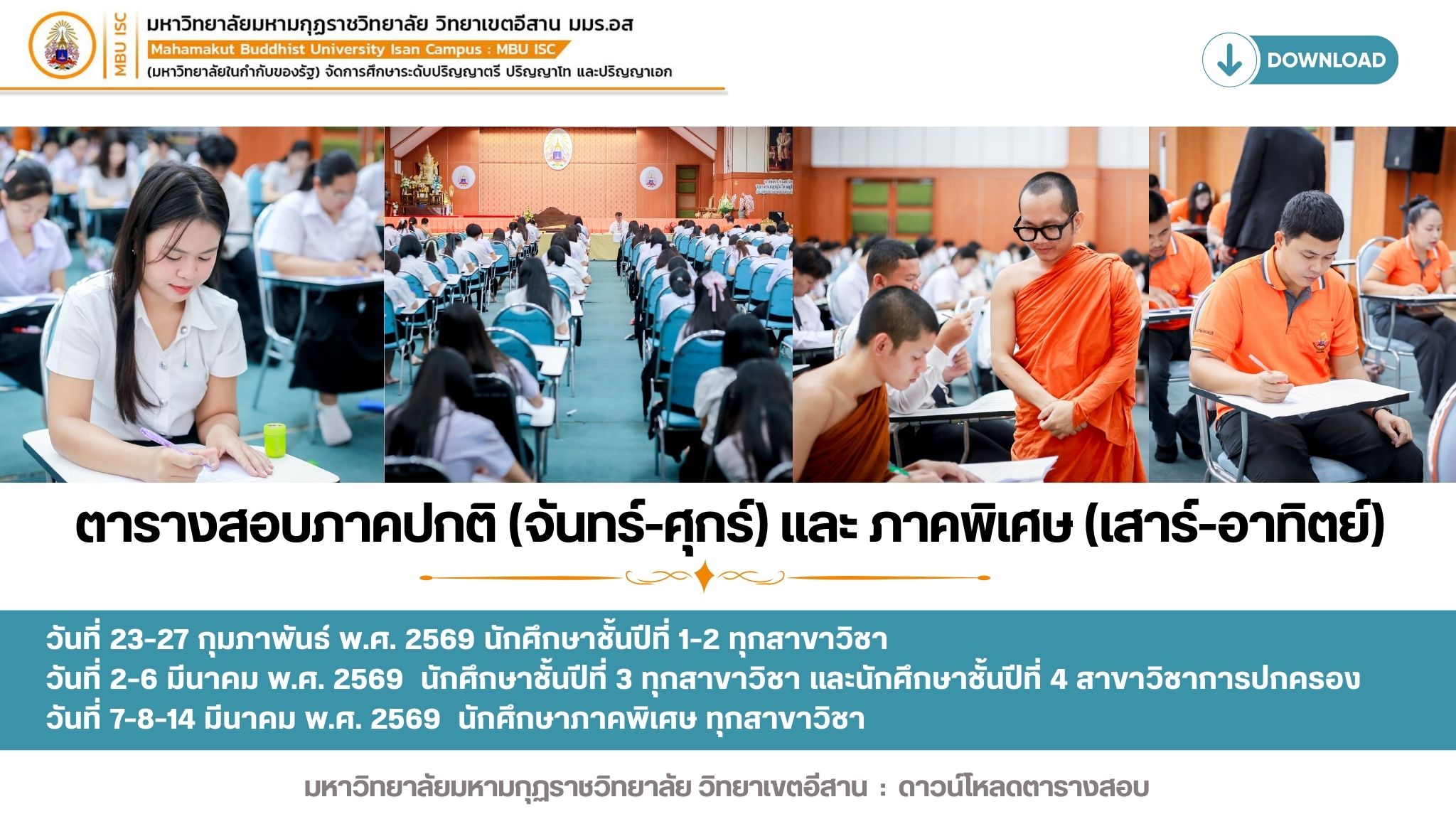 ดาวน์โหลดตารางสอบวัดผลปลายภาคเรียน 2/2568 ภาคปกติและภาคพิเศษ มหาวิทยาลัยมหามกุฏราชวิทยาลัย วิทยาเขตอีสาน ตารางสอบ (ภาคปกติ) ทุกชั้นปี