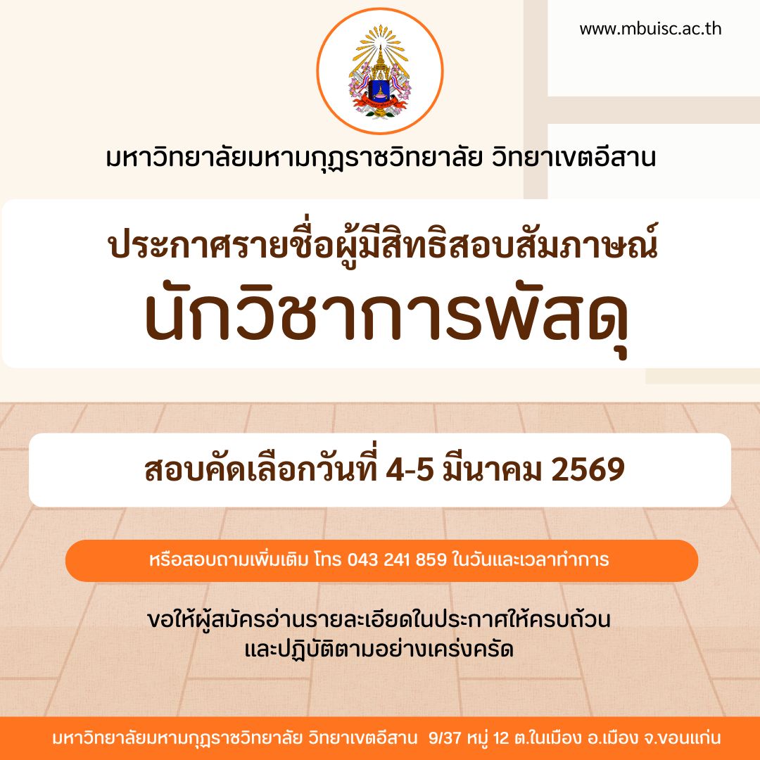 ประกาศรายชื่อผู้มีสิทธิ์สอบสัมภาษณ์ นักวิชาการพัสดุ มหาวิทยาลัยมหามกุฏราชวิทยาลัย วิทยาเขตอีสาน ดาวน์โหลดประกาศด้านล่างนี้ ดาวน์์โหลดประกาศ