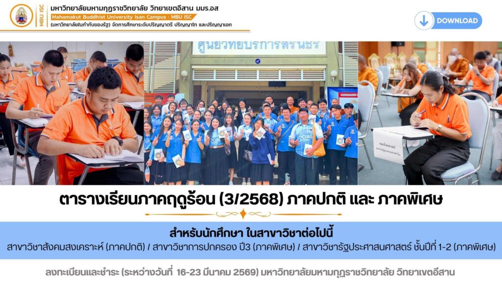 ดาวน์โหลดตารางเรียน ภาคฤดูร้อน3/2568 มหาวิทยาลัยมหามกุฏราชวิทยาลัย วิทยาเขตอีสาน ลงทะเบียนและชำระค่าเทอม ระหว่างวันที่ 16-23 มีนาคม 2569