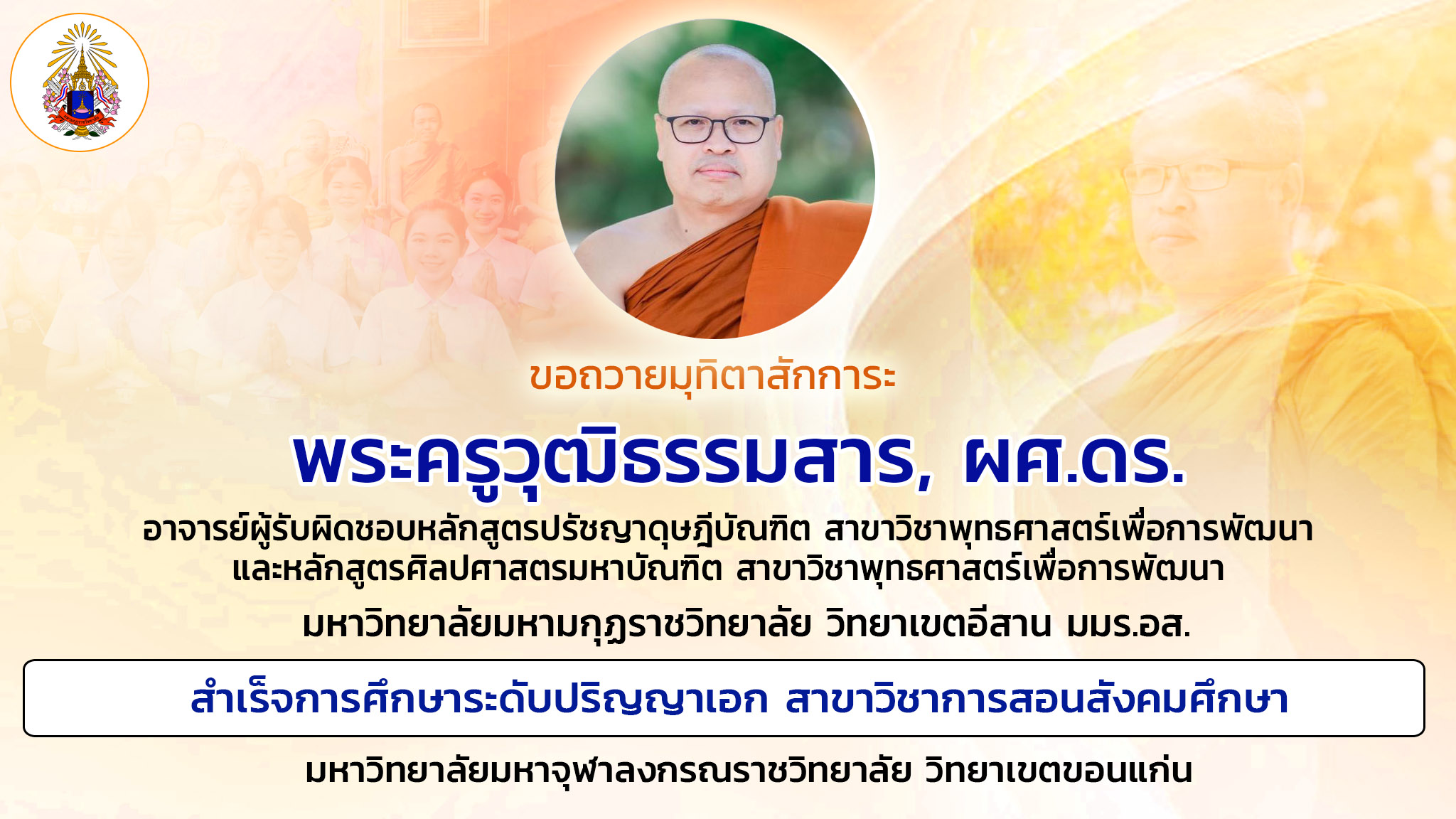 ขอถวายมุทิตาสักการะ พระครูวุฒิธรรมสาร, ผศ.ดร. อาจารย์ผู้รับผิดชอบหลักสูตรปรัชญาดุษฎีบัณฑิต สาขาวิชาพุทธศาสตร์เพื่อการพัฒนาและหลักสูตรศิลปศาสตรมหาบัณฑิต สาขาวิชาพุทธศาสตร์เพื่อการพัฒนา มหาวิทยาลัยมหามกุฏราชวิทยาลัย วิทยาเขตอีสาน มมร.อส. สำเร็จการศึกษาระดับปริญญาเอก…