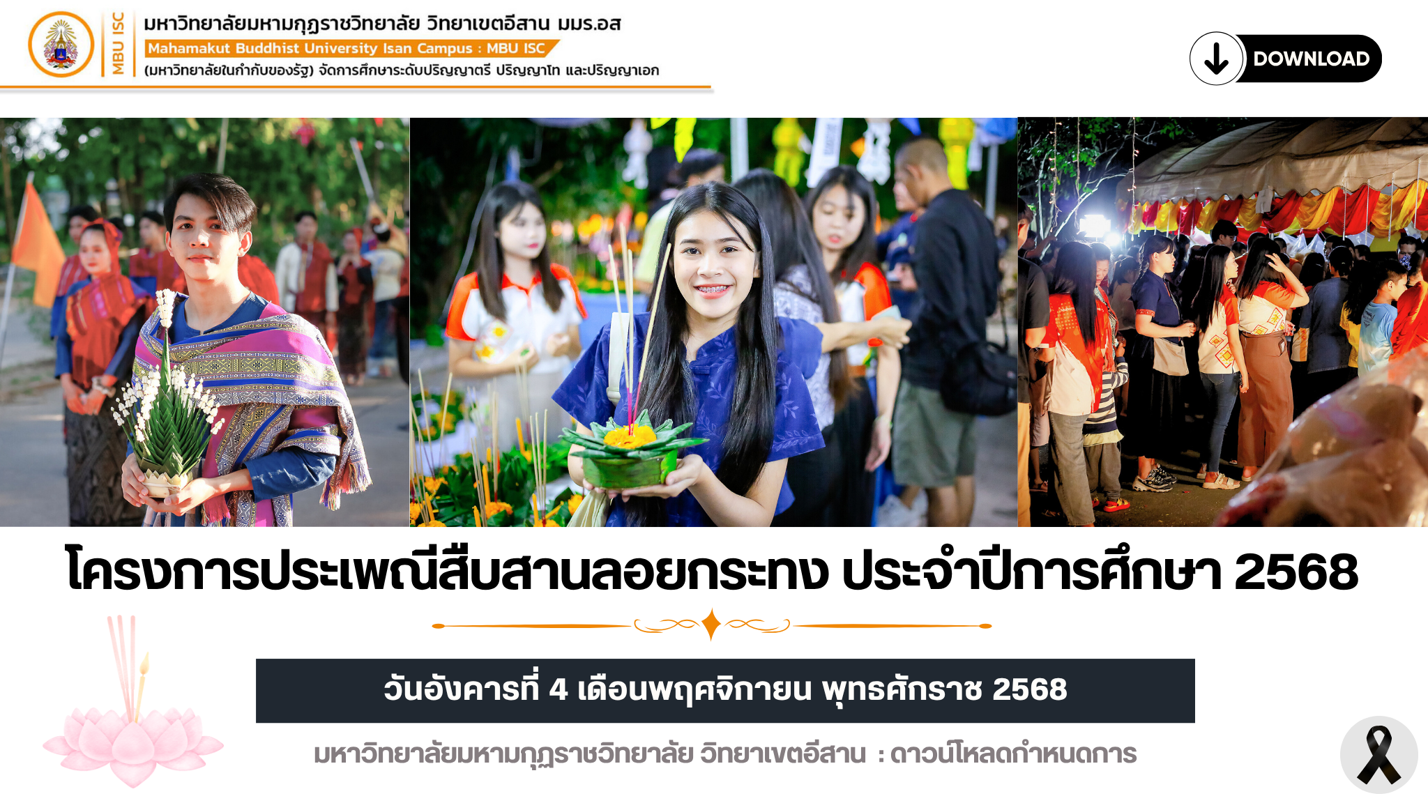 โครงการประเพณีสืบสานลอยกระทง ประจำปีการศึกษา 2568 วันอังคารที่ 4 พฤศจิกายน 2568 ณ มหาวิทยาลัยมหามกุฏราชวิทยาลัย วิทยาเขตอีสาน