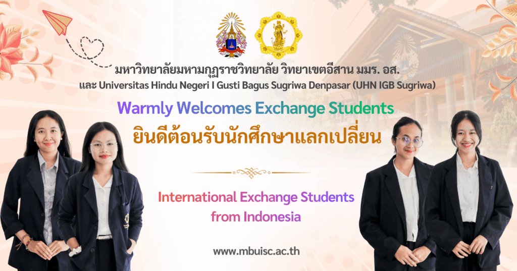 มหาวิทยาลัยมหามกุฏราชวิทยาลัย วิทยาเขตอีสาน โดย พระสุธีวชิรธรรม ผศ.ดร. รองอธิการบดี ได้จัดปฐมนิเทศ ต้อนรับนักศึกษา Exchange Student from ประเทศอินโดนิเซีย พร้อมด้วยคณะอาจารย์และนักศึกษา Nk Komang Tri Wahyuni P. Ni Komang Ayu Artha Givana. Ni Komang Sri Diantari. Tjokorda Istri Sindy จาก UHN IGB Sugriwa